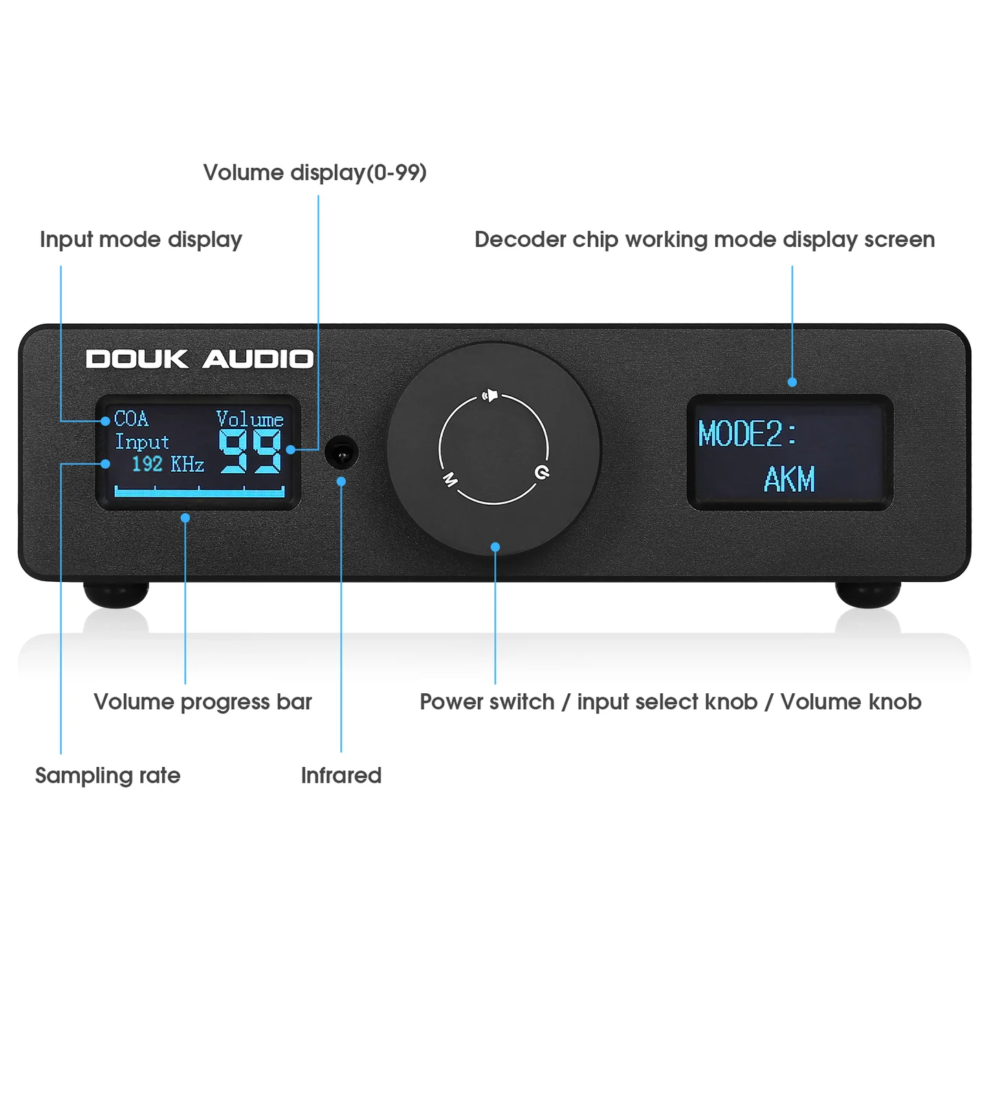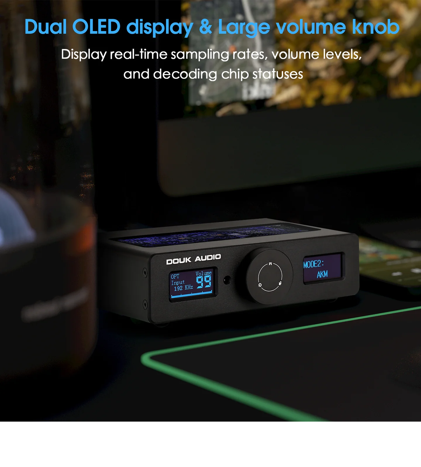 - Dual OLED display & Large volume knob: 2 PCS of OLED screens can display real-time sampling rates, volume levels, and decoding chip statuses, enhancing user convenience. Designed with an easy-to-use large-sized volume control knob, ensuring that users can make delicate and precise volume adjustments to meet personalized listening preferences.