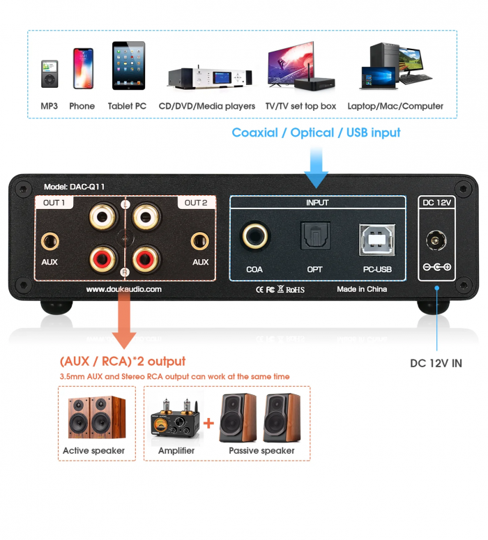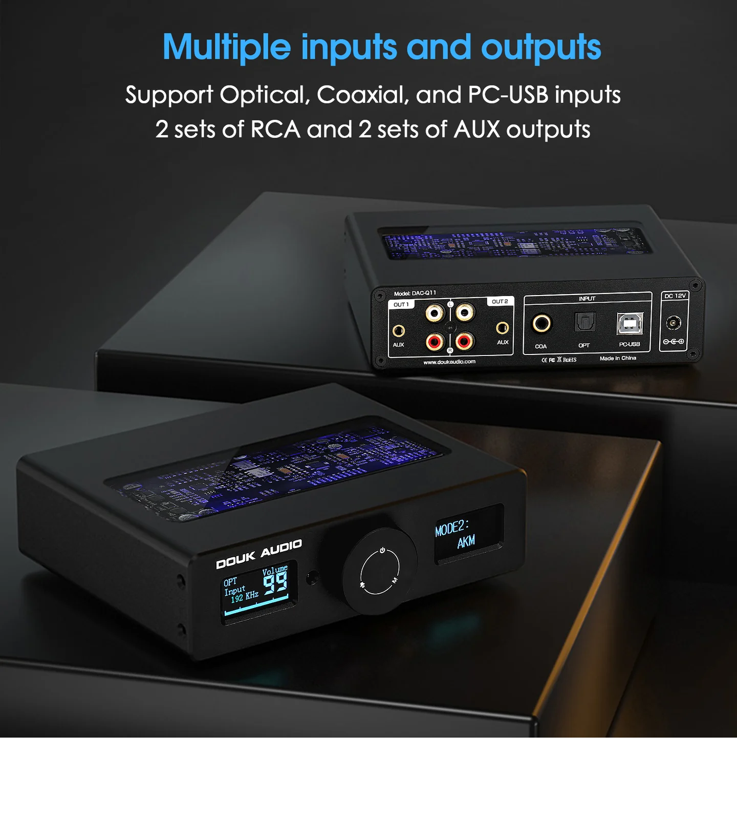 - Multiple inputs and outputs: Support Optical, Coaxial, and PC-USB inputs, compatible with audio sources such as mobile phones, computers, and digital players. With 2 sets of RCA and 2 sets of AUX outputs, providing users with a wide range of connection options, facilitating integration with various audio sources and playback devices, and adapting to different usage scenarios.