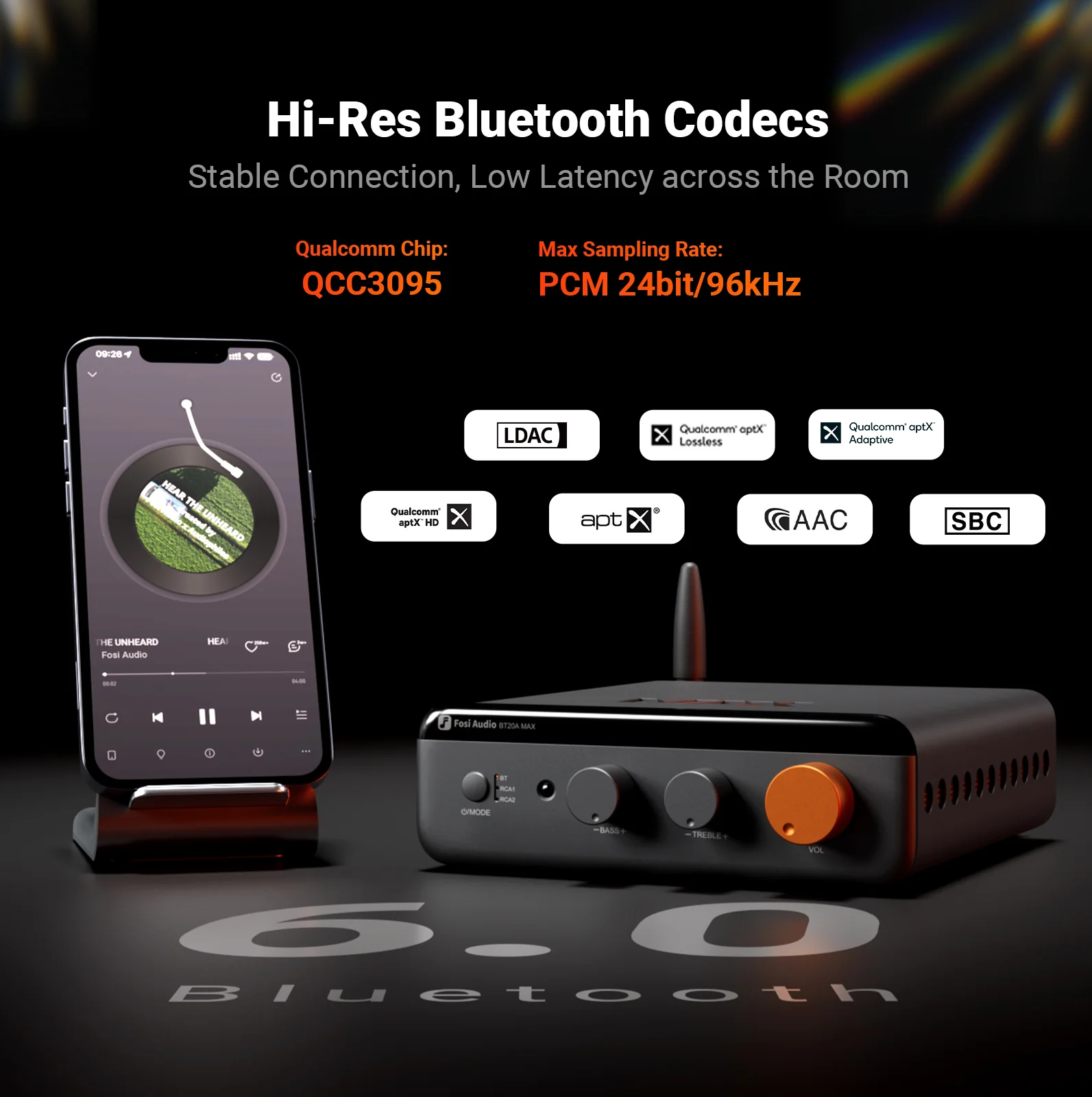 Hi-Res Bluetooth Connectivity: Equipped with Qualcomm Chip QCC3095, Bluetooth 6.0 with support for LDAC/aptX Lossless/aptX HD/aptX Adaptive/aptX/SBC/AAC codecs, max sampling rate PCM 24bit/96kHz. Delivering a stable, low-latency connection.