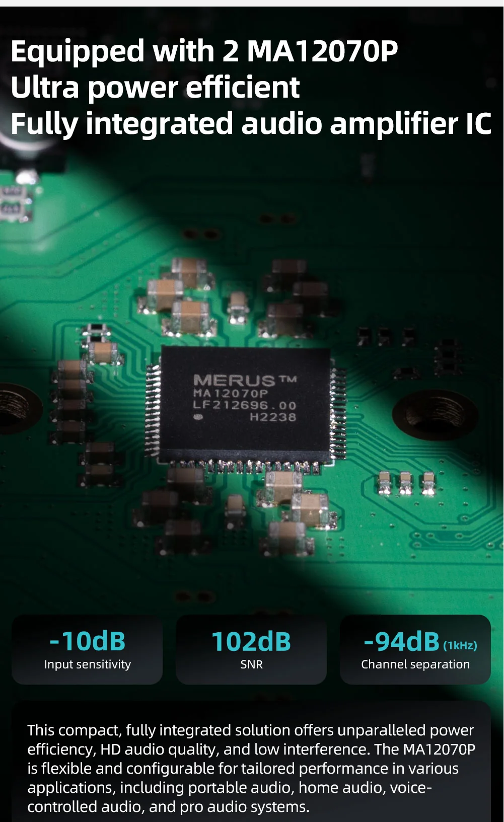 Using 2 pieces of German Infineon new silicon carbide digital power amplifier chip, higher quality at the same time, efficiency up to 92%, further reducing energy consumption;