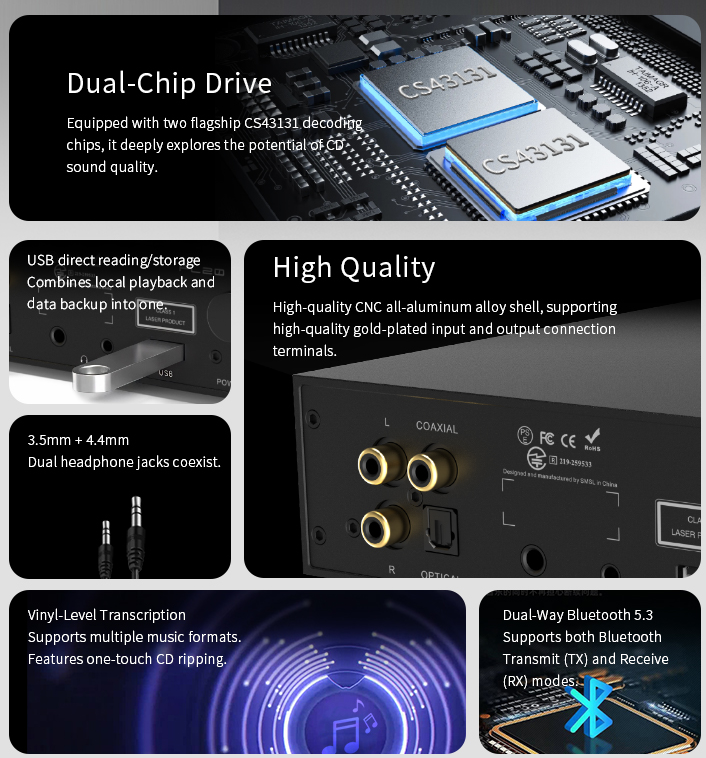 Built-in two CS43131 decoding chips to maximize the performance of CD;