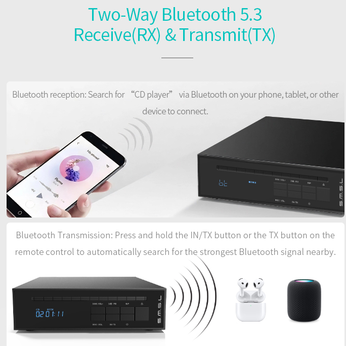 Support a variety of music formats DSD64(DFF/DSF) WAV/FLAC/APE/WMA/MP3, etc.Bidirectional Bluetooth 5.3, supports Bluetooth transmitting and receiving modes, and iscompatible with most Bluetooth devices.