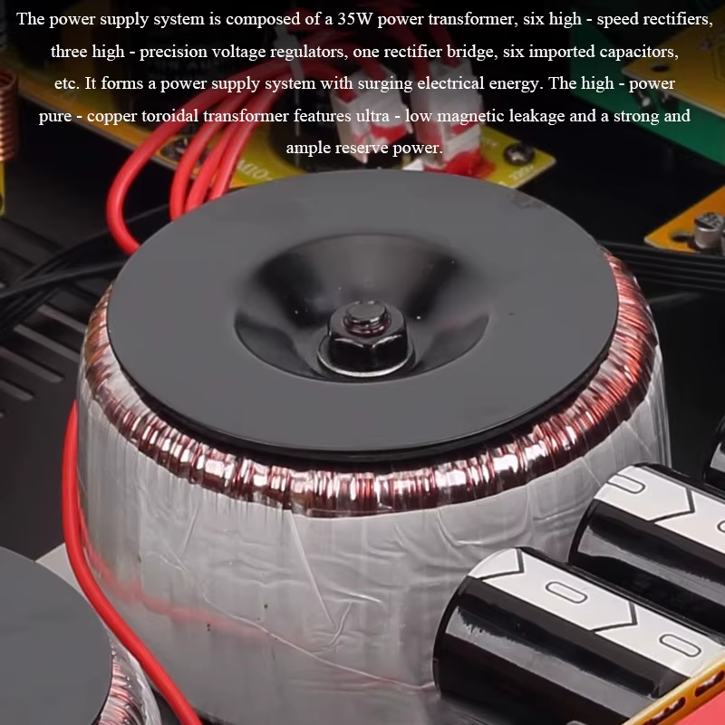 The power supply system consist of a 35W power transformer, 6 high-speed rectifier, 3 high-precision voltage regulator, a rectifier bridge, 6 imported capacitor.