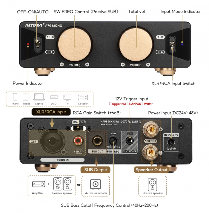 5. Enhanced Functional Features: Includes a 6dB gain boost for RCA inputs, an active subwoofer output with adjustable frequency (40-200Hz), and dual-mode switching for full-range or passive subwoofer output, accommodating diverse audio configurations from mono to 7.1-channel setups.