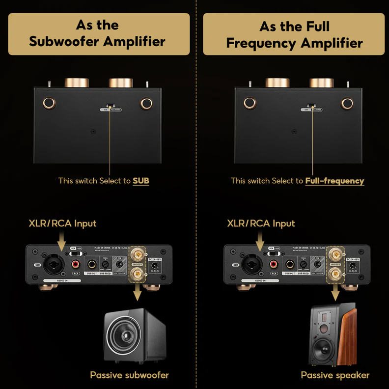 5. Enhanced Functional Features: Includes a 6dB gain boost for RCA inputs, an active subwoofer output with adjustable frequency (40-200Hz), and dual-mode switching for full-range or passive subwoofer output, accommodating diverse audio configurations from mono to 7.1-channel setups.