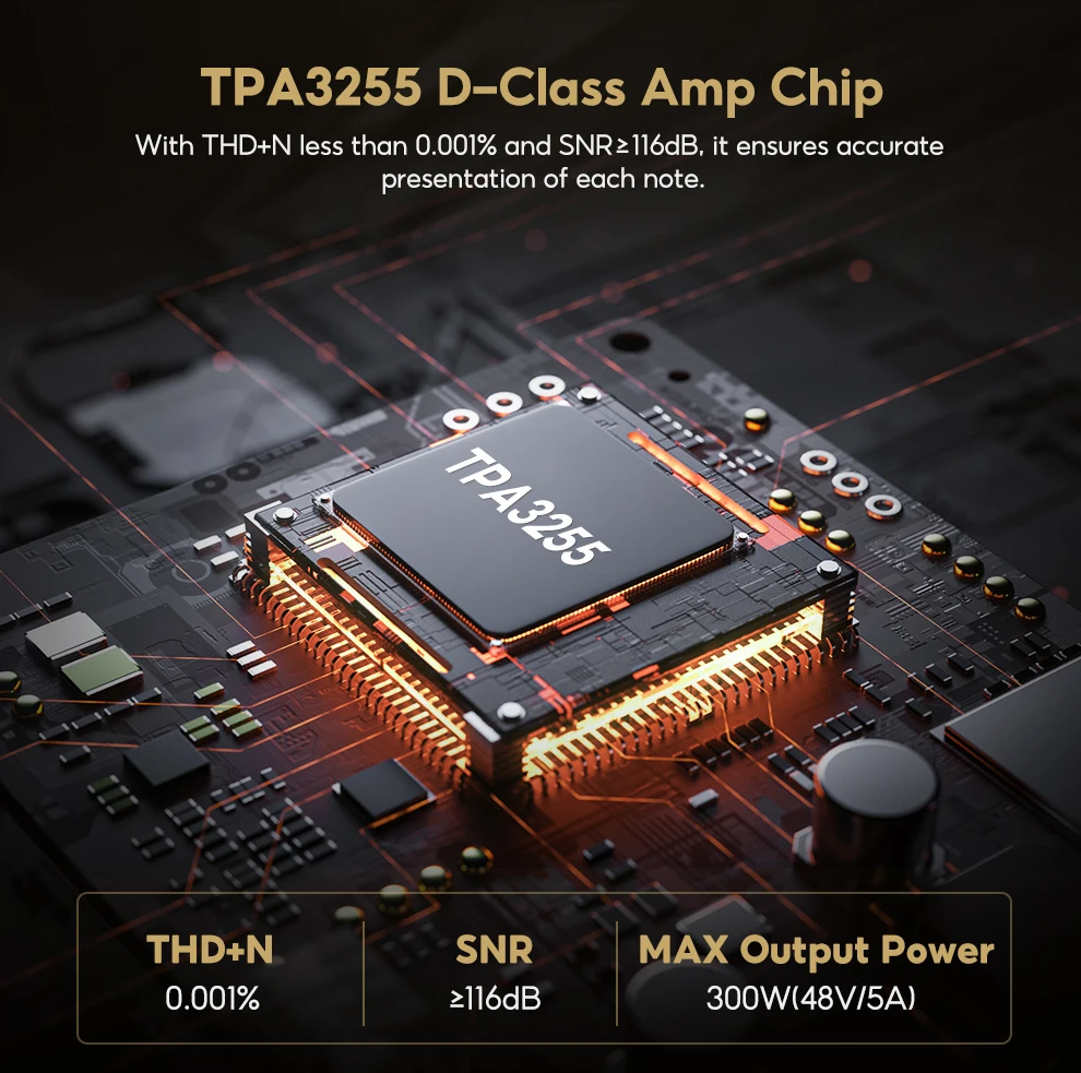 4. Advanced Class D Amplification: Equipped with TI’s TPA3255 chip and PurePath Ultra-HD technology, it delivers up to 600W Mono at 2Ω with minimal distortion and excellent performance, ensuring robust and dynamic sound output.