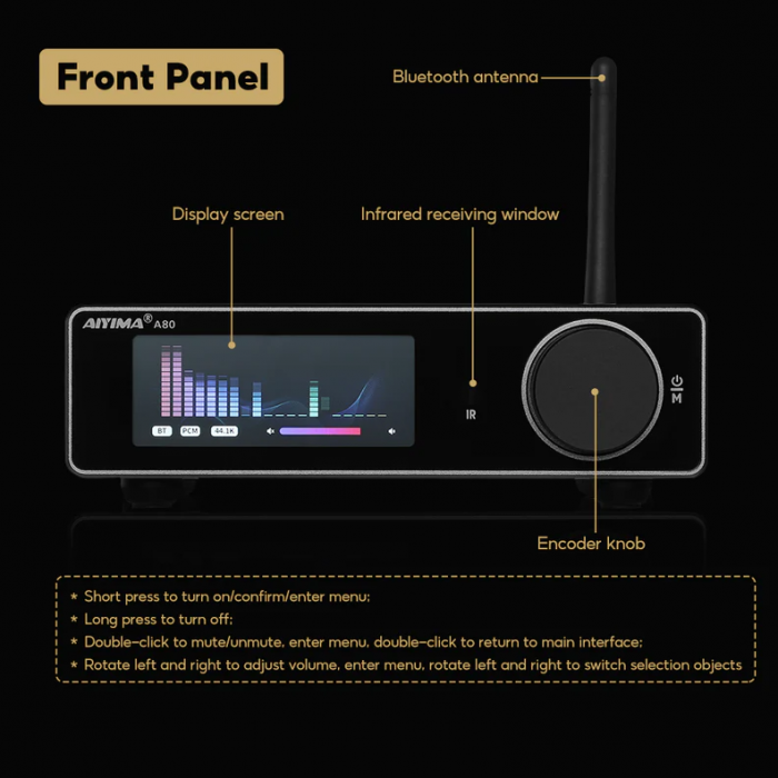 Using the ES9038Q2M high-performance decoder chip, combined with the TPA3255 high-power ultra-low distortion amplifier chipset, the AIYIMA A80 supports DSD512 and PCM ultra-high-resolution audio, providing users with rich and delicate sound details.