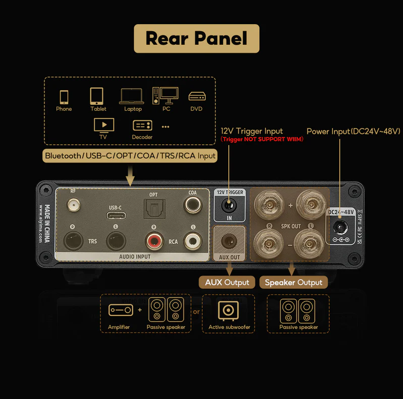 The A80 supports 3.5mm AUX and RCA outputs, suitable for connecting different types of amplifiers or audio equipment. The 3.5mm output connector can be flexibly set up for 2.0/2.1-channel home audio receiver systems.
