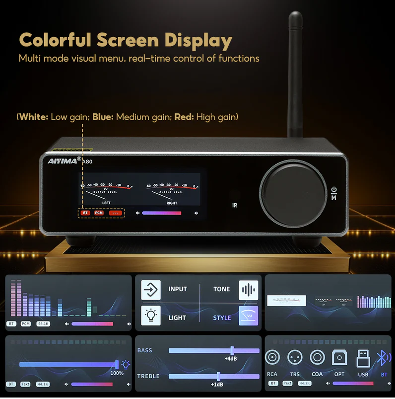 Using the ES9038Q2M high-performance decoder chip, combined with the TPA3255 high-power ultra-low distortion amplifier chipset, the AIYIMA A80 supports DSD512 and PCM ultra-high-resolution audio, providing users with rich and delicate sound details.