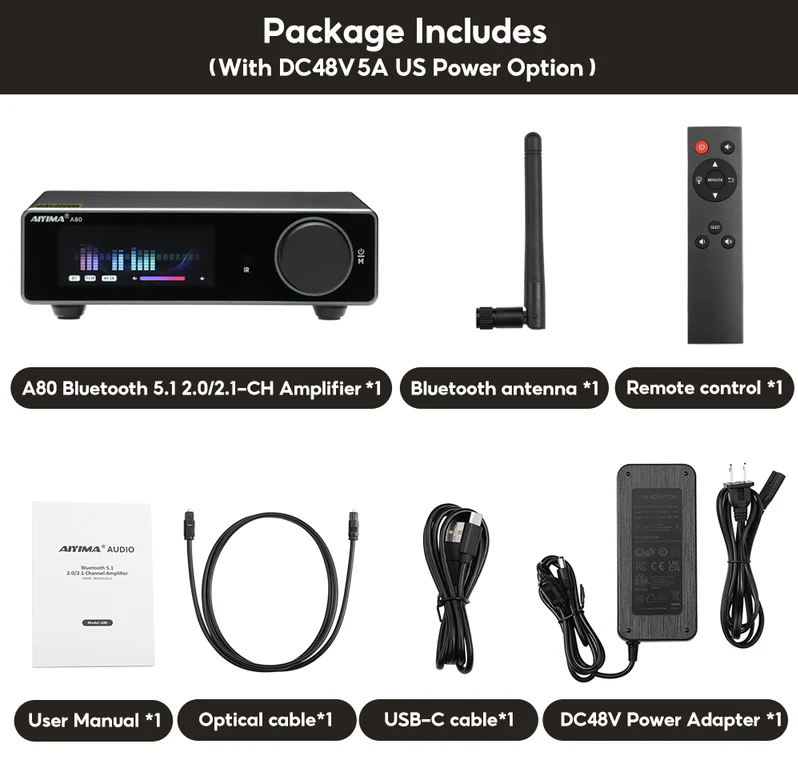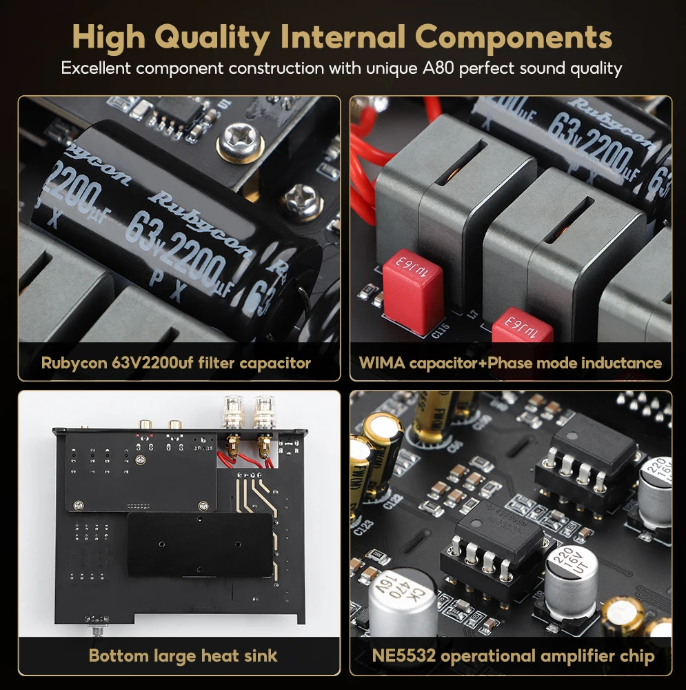 The AIYIMA A80 Bluetooth Power Amplifier adopts the high-performance TPA3255 Class D amplifier chip, with Rubycon capacitors, German WIMA capacitors, and professional audiophile-grade components. It ensures high power output, achieving a total harmonic distortion (THD) as low as 0.006% and a signal-to-noise ratio (SINAD) of 109dB, delivering exceptional Hi-Fi audio sound.