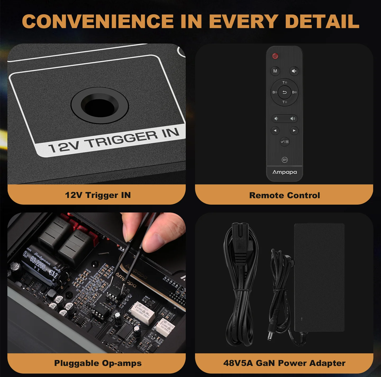 - Premium Components for Superior Fidelity: Pluggable NE5532 op-amps allow for effortless upgrades, while PFFB technology eliminates load dependency, enhancing performance and sound quality. From NJW1194 chip, SAGAMI inductors, 2oz copper PCB to GaN 48V/5A power adapter, every element is chosen for sonic purity.