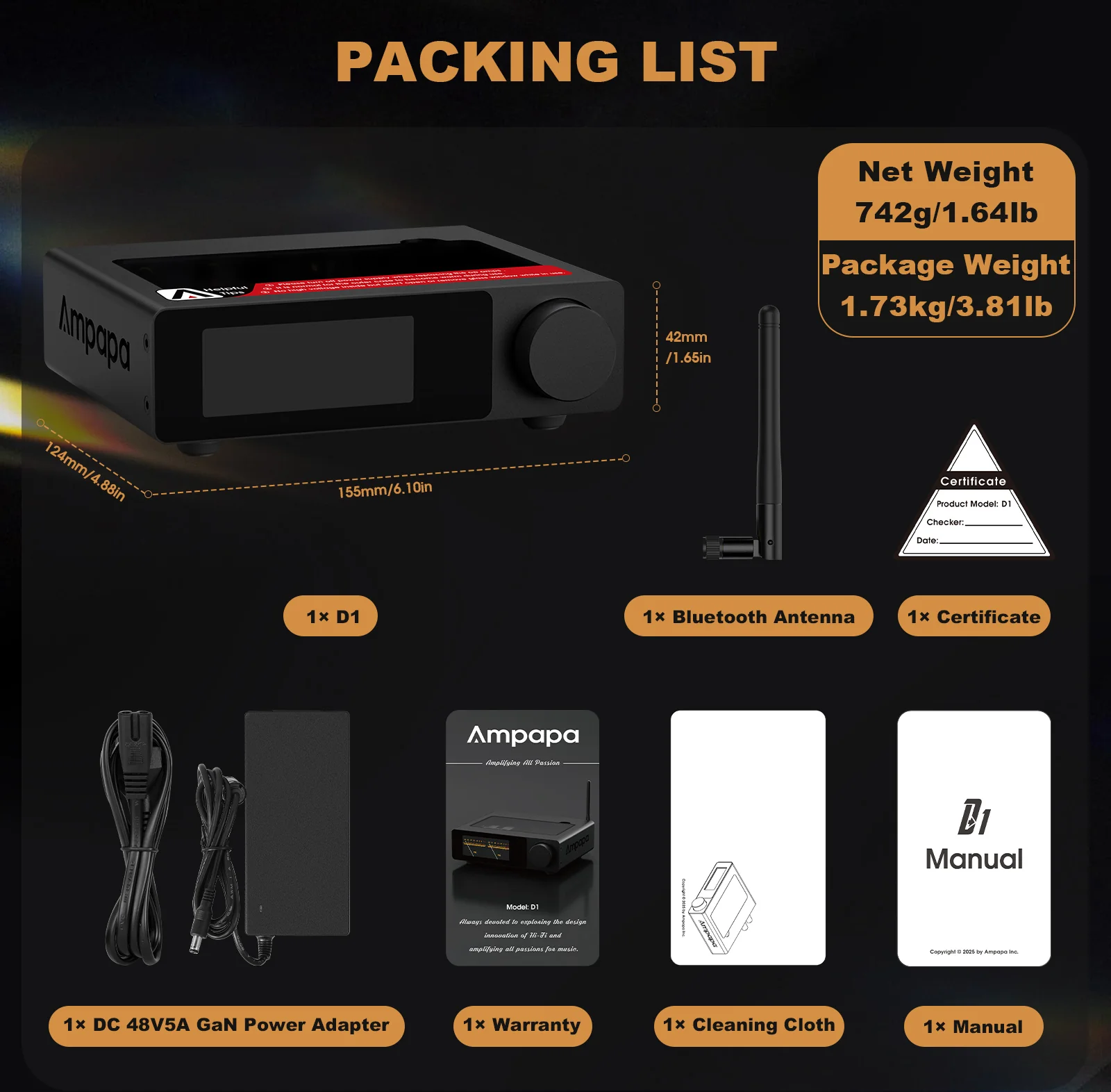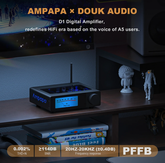 - Ampapa × Douk Audio Collaboration: Built on the acclaimed Douk Audio A5 amp, the D1 retains core features like TPA3255 chip, HPF, PRE-OUT, socketed op-amps—now upgraded with digital VU display, TRS balanced input, Bluetooth 5.2, treble/bass control, remote and more for next-gen HiFi performance.
