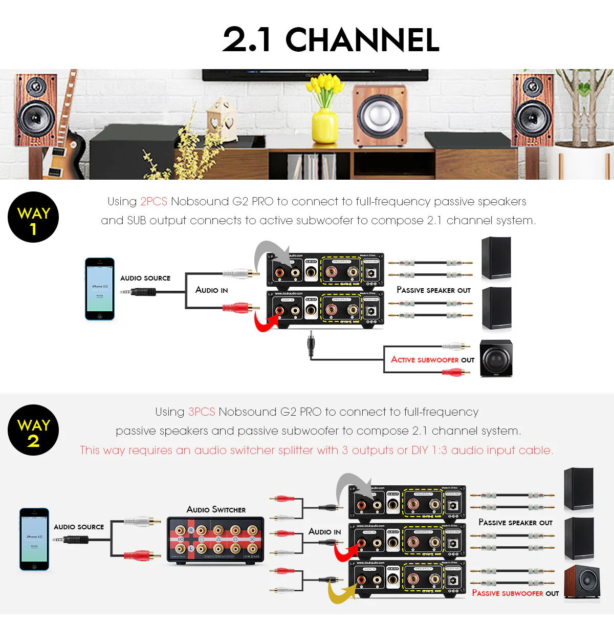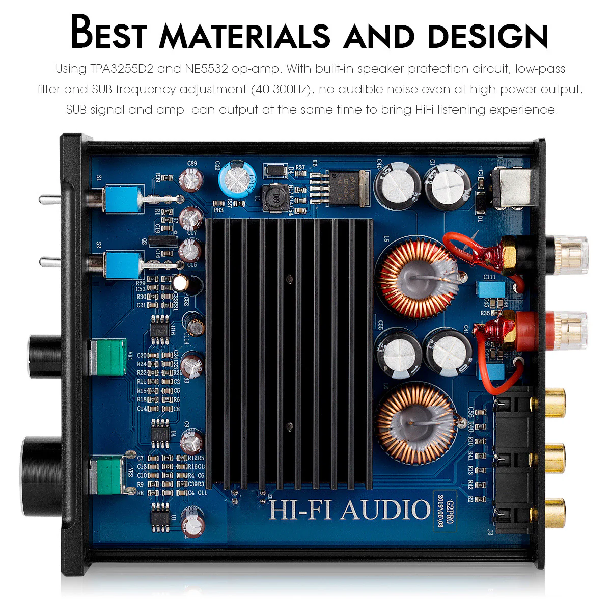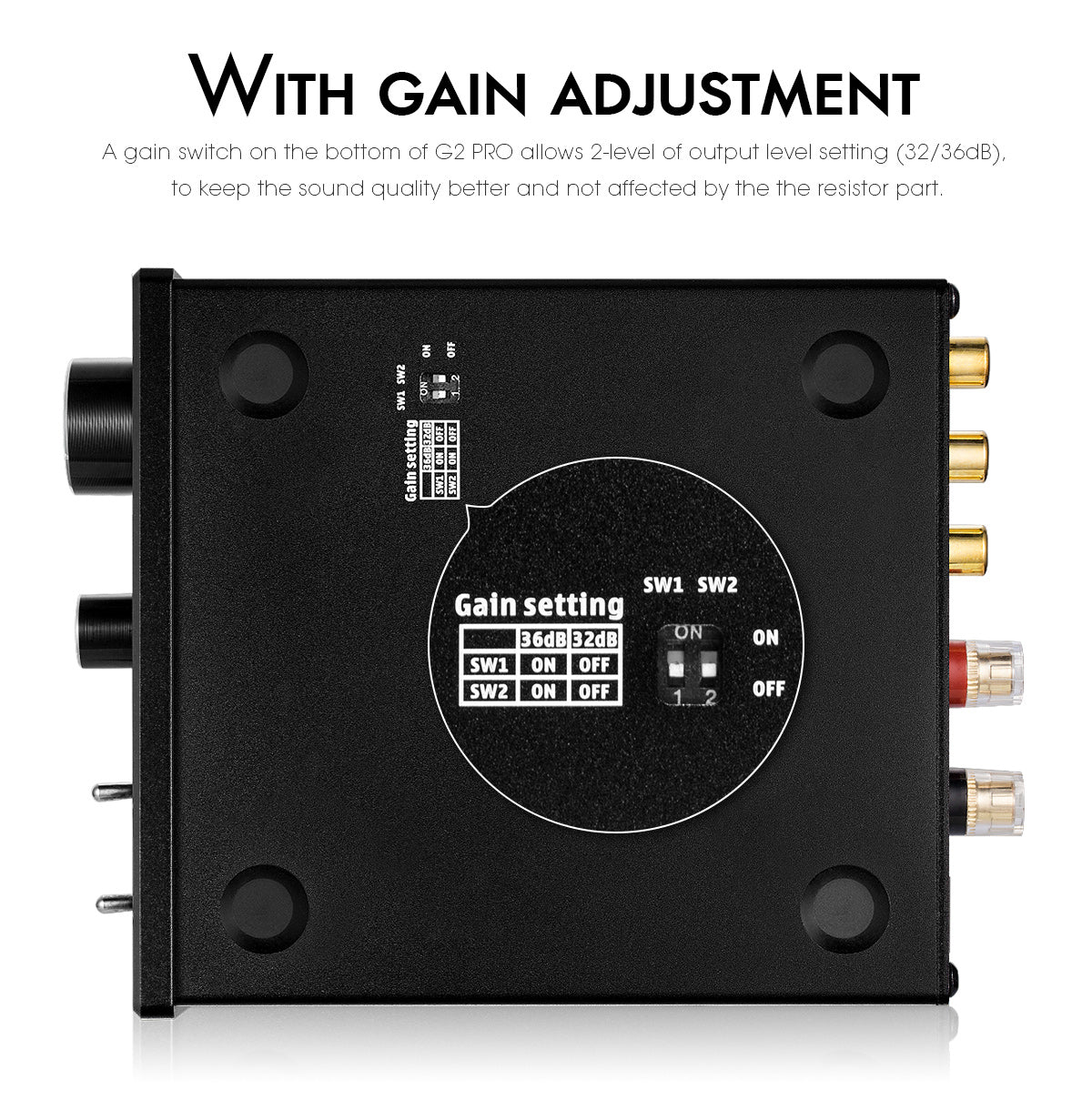 - Best design and HiFi sound: with a gain switch to allow 2-level of output level setting (32/36 dB) and SUB frequency adjustment (40-300Hz). It also has built-in speaker protection circuit, low-pass filter to guarantee no audible noise even at high power output, SUB signal and amp can output at the same time to bring HiFi listening experience.