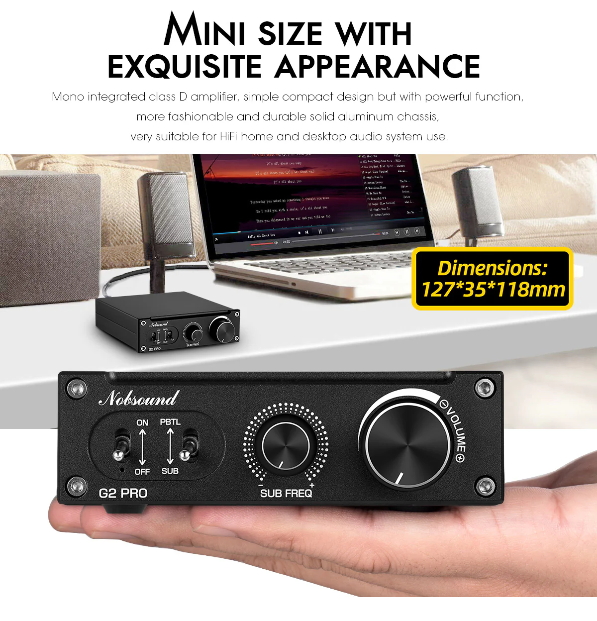 - Mini size with exquisite appearance: mono integrated class D amplifier, simple compact design but with powerful function, more fashionable and durable solid aluminum chassis, very suitable for HiFi home and desktop audio system use.