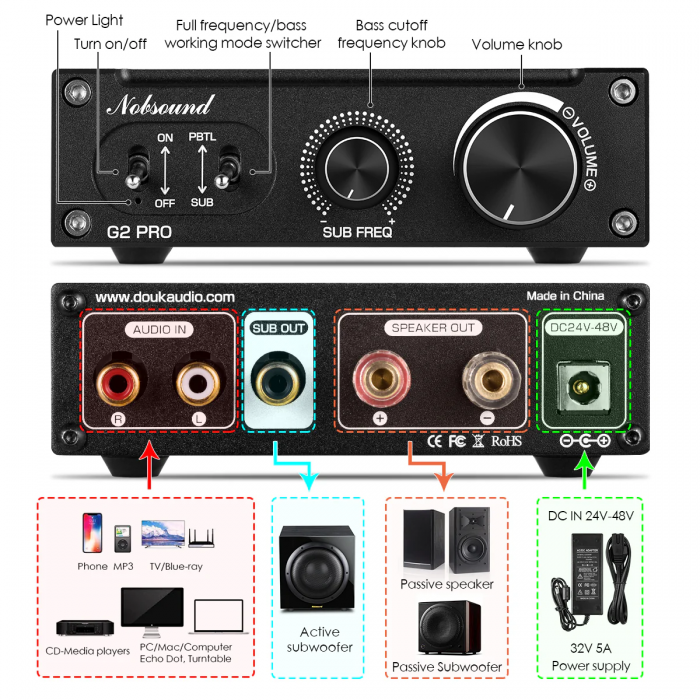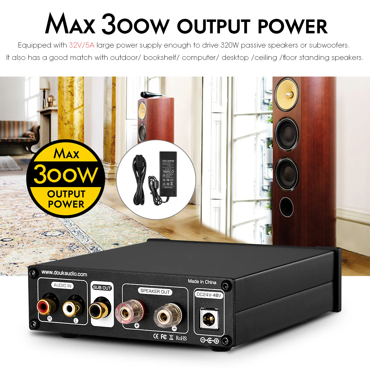 - Max 300W output power: using TPA3255D2 amp chip and equipped with 32V/5A large power supply, enough to drive 320W passive speakers or subwoofers. It also has a good match with outdoor/ bookshelf/ computer/ desktop /ceiling /floor standing speakers.