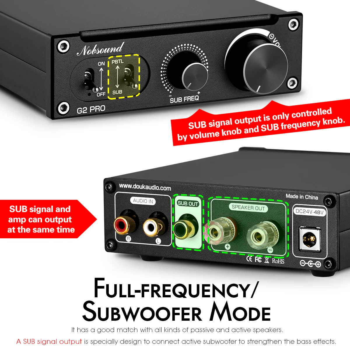 - With PBTL/SUB switch: convenient to use G2 PRO as full frequency amp or subwoofer amp, a SUB output is specially designed for active subwoofer. G2 PRO can connect to both passive and active subwoofers. And two G2 PRO can be used to drive left and right channel independently to avoid mutual interference.