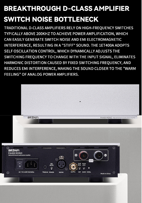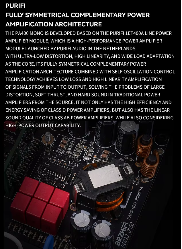 * It uses switching power supply + efficient Class-D architecture — so you can expect good efficiency, less heat compared with big Class A/AB amps. For example the spec sheet: “Efficiency >94%” for Purifi 1ET400A.